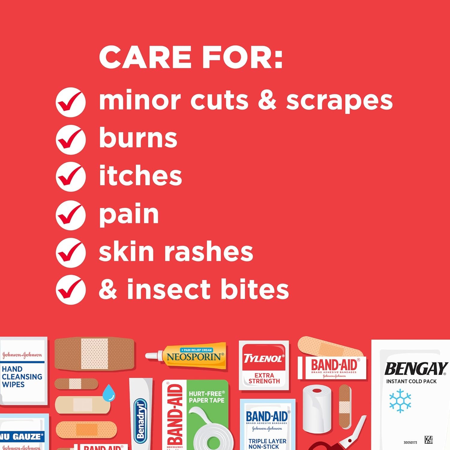 - El botiquín de auxilios johnson&johnson de 160 piezas es ideal para el hogar, en automóviles, al aire libre, dormitorios, y mientras acampas, cocinas o viajas para ayudar a cuidar cortes menores, rasguños, quemaduras, picazón, dolor, erupciones cutáneas y picaduras de insectos