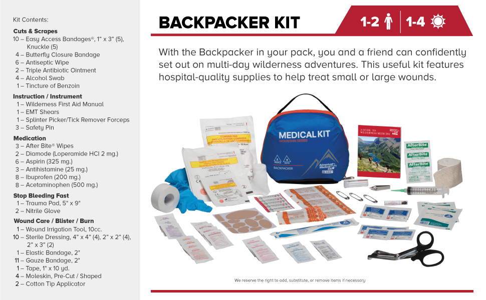 - Diseñado como un botiquín de grado expedición, el Kit médico para montaña Adventure Medical Kits ofrece suministros seleccionados para atender a hasta 2 personas durante 4 días. Es la opción ideal para mochileros y equipos que buscan un equilibrio entre cobertura médica realista y portabilidad: incluye vendajes, control de sangrado, medicación básica y herramientas que permiten responder con rapidez ante lesiones en rutas prolongadas o zonas sin acceso inmediato a asistencia sanitaria.